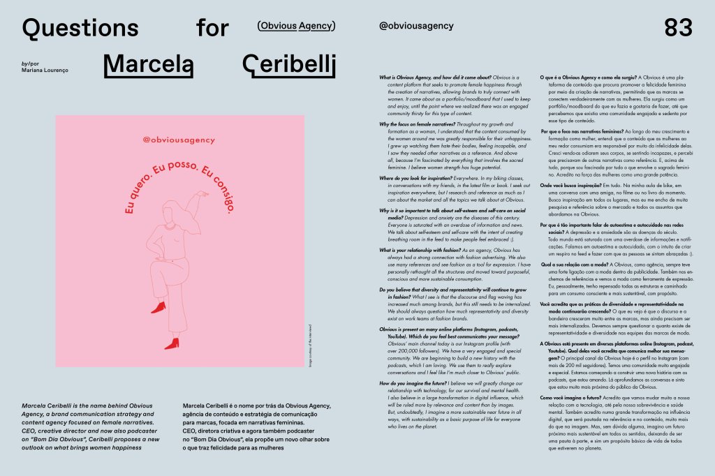 Marcela Ceribelli is the name behind Obvious Agency, a brand communication strategy and content agency focused on female narratives. CEO, creative director and now also podcaster on “Bom Dia Obvious”, Ceribelli proposes a new outlook on what brings women happiness.