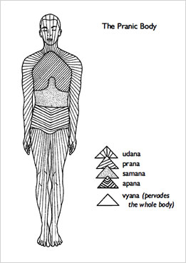 The breath is our main source of prana yet breathing is just an entrance to the world of prana and its manifestation in the body. Prana regulates all vital functions in our system through five energetic expressions called vayus. Each of them governs different areas of the body and different physical and subtle functions: