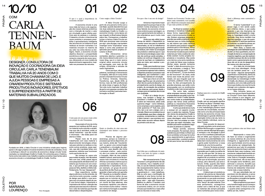 Carla Tennenbaum é designer, consultora de inovação e cocriadora da Ideia Circular. Fundada em 2015, a Ideia Circular é uma iniciativa criada para inspirar, apoiar e divulgar projetos circulares brasileiros através de conteúdos, livros e workshops e discutir os conceitos de economia e design circular fundamentados na metodologia Cradle to Cradle. Há 20 anos, Carla trabalha com o que muitos chamam de lixo, ajudando pessoas e empresas a criarem produtos e sistemas produtivos inovadores, efetivos e surpreendentes a partir de materiais subvalorizados. Em entrevista para o Coletivo, Carla conta mais sobre o seu trabalho e explica conceitos importantes sobre economia circular e a metodologia Cradle to Cradle. Confira: