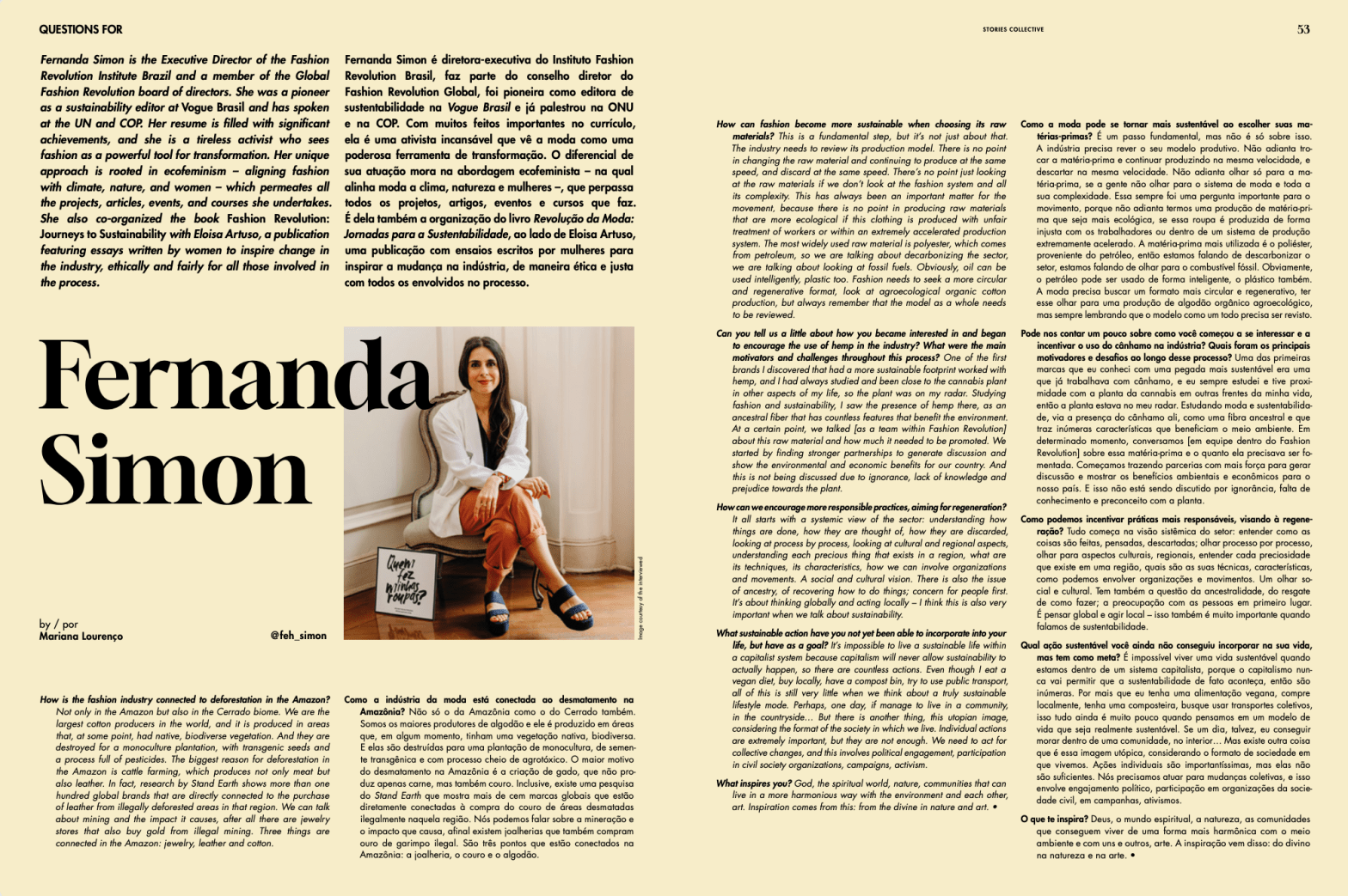 Fernanda Simon is the Executive Director of the Fashion Revolution Institute Brazil and a member of the Global Fashion Revolution board of directors. She was a pioneer as a sustainability editor at Vogue Brazil and has spoken at the UN and COP.